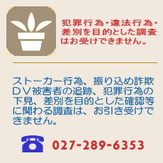 群馬県公安委員会探偵業届出番号 第42080024号 TEL 027-289-6353 FAX 027-289-6352